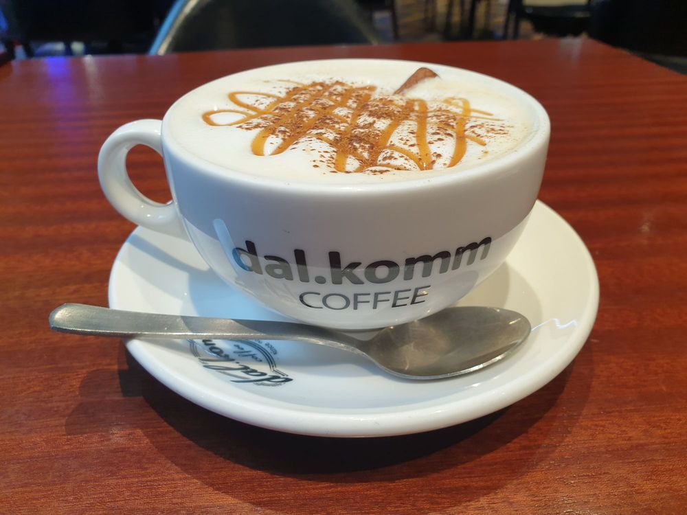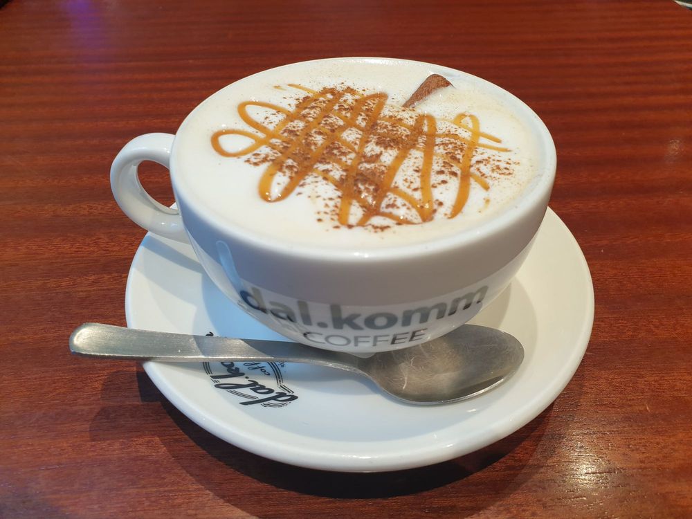 A cold creamy milk with frozen coffee cubes made using dal .komms very own proprietary natura light coffee blend